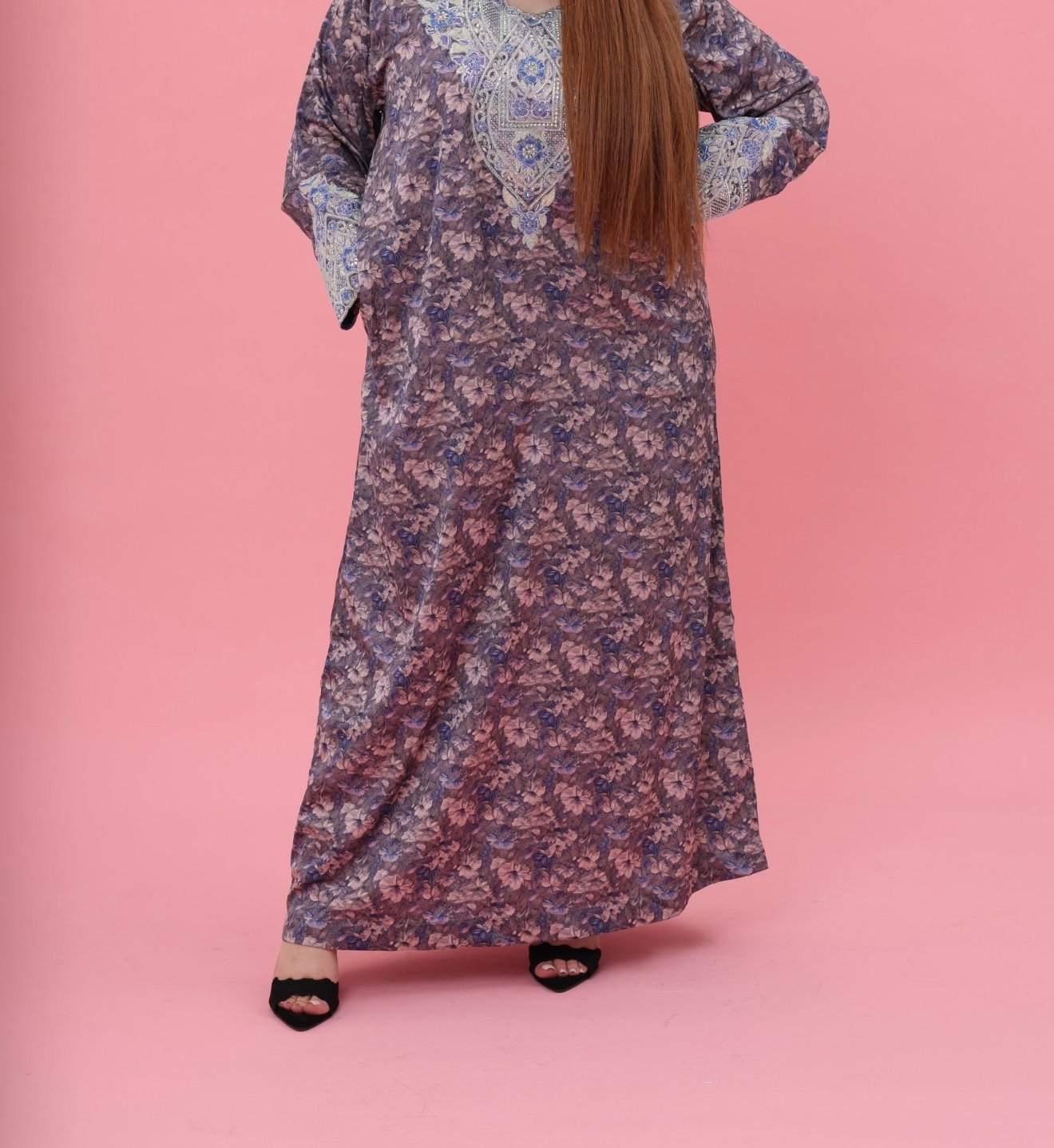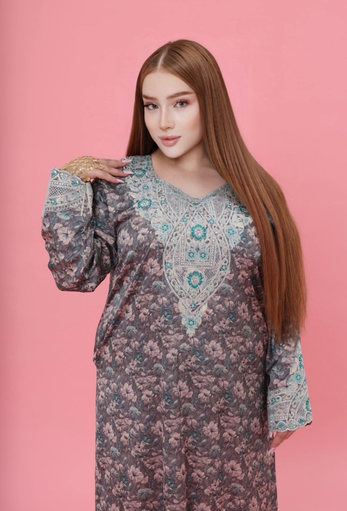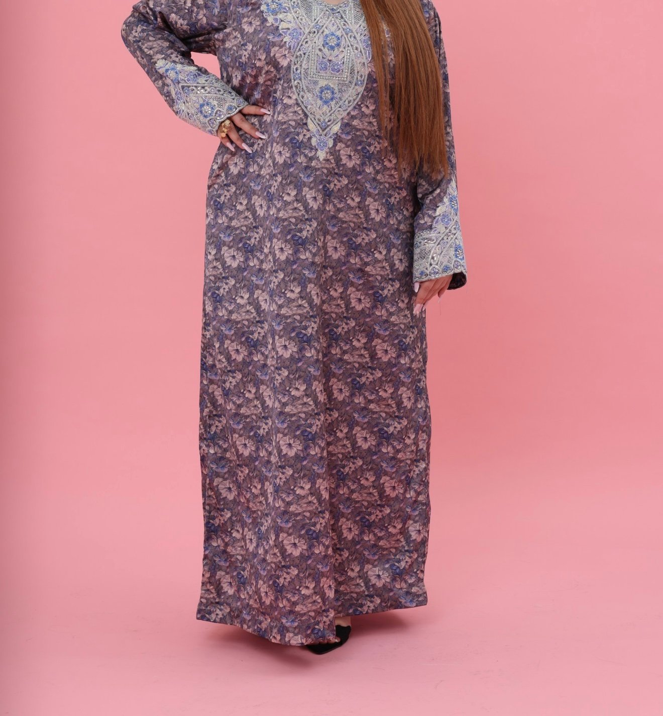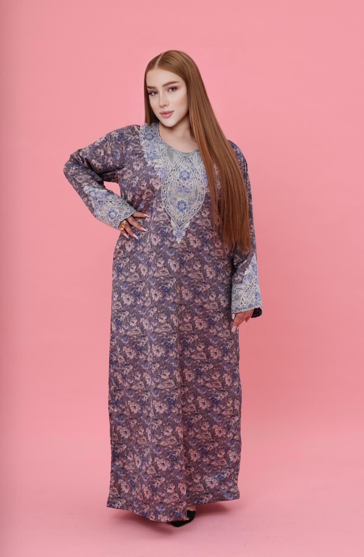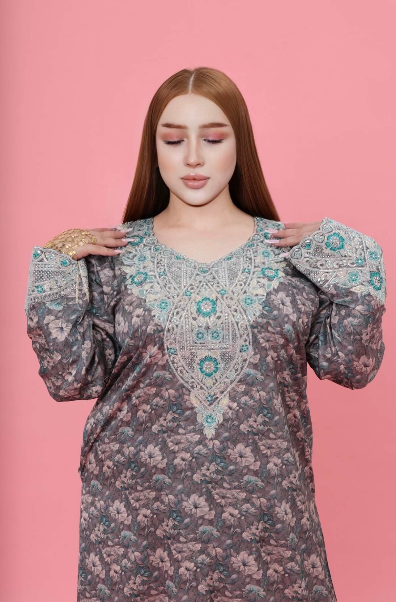 The kaftan features delicate silk-like softness complemented by intricate luxury embroidery carefully crafted across the chest and sleeves. The detailed embellishments create a stunning visual harmony, blending traditional artistry with modern sophistication.