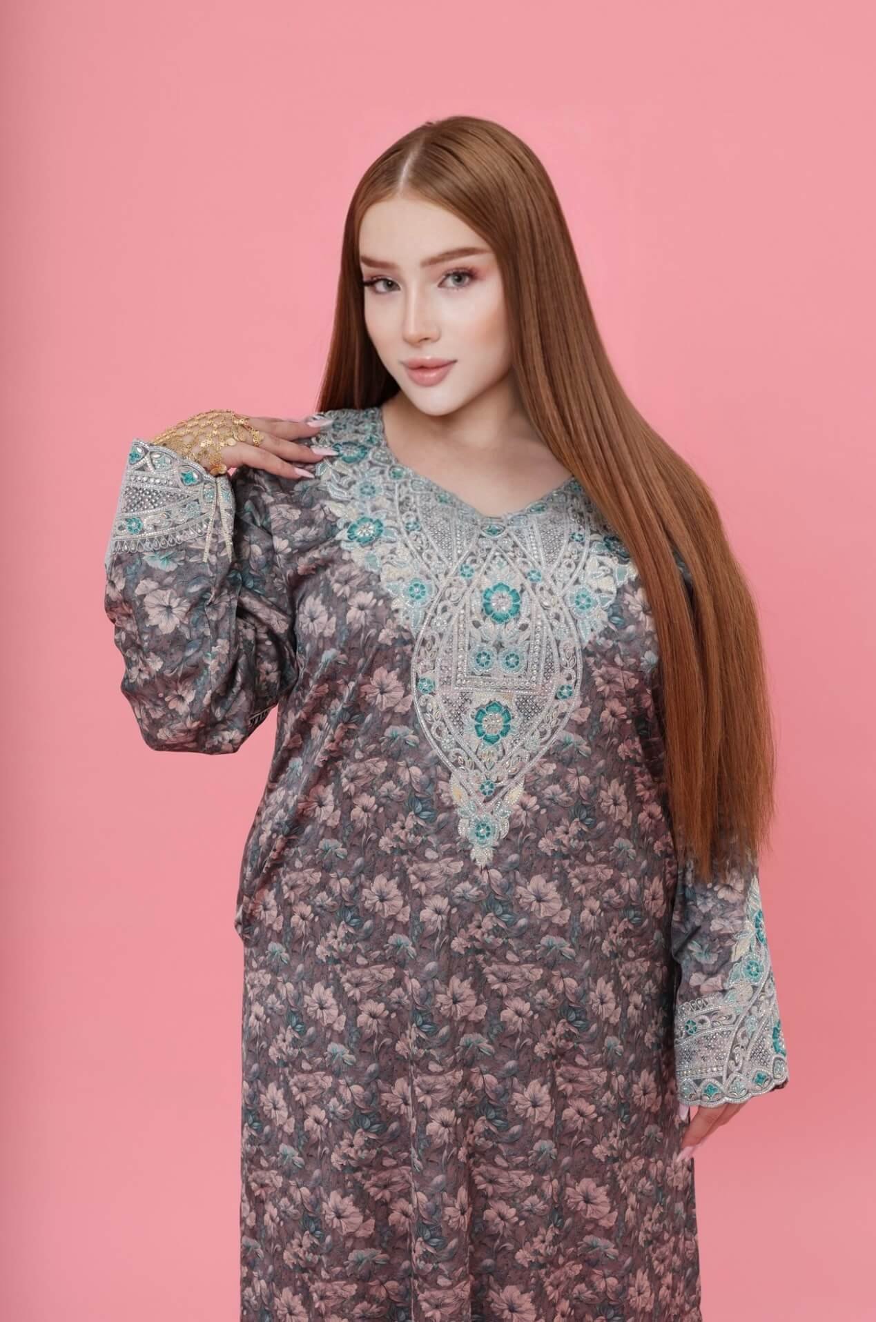 Experience timeless elegance with the Mina Badr Royal Kaftan, where luxurious softness meets exquisite craftsmanship. Designed in a rich brown floral fabric, this piece offers a refined silhouette that flows gracefully with every movement.