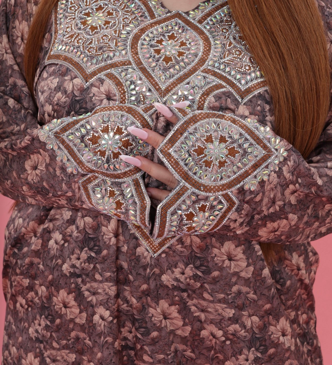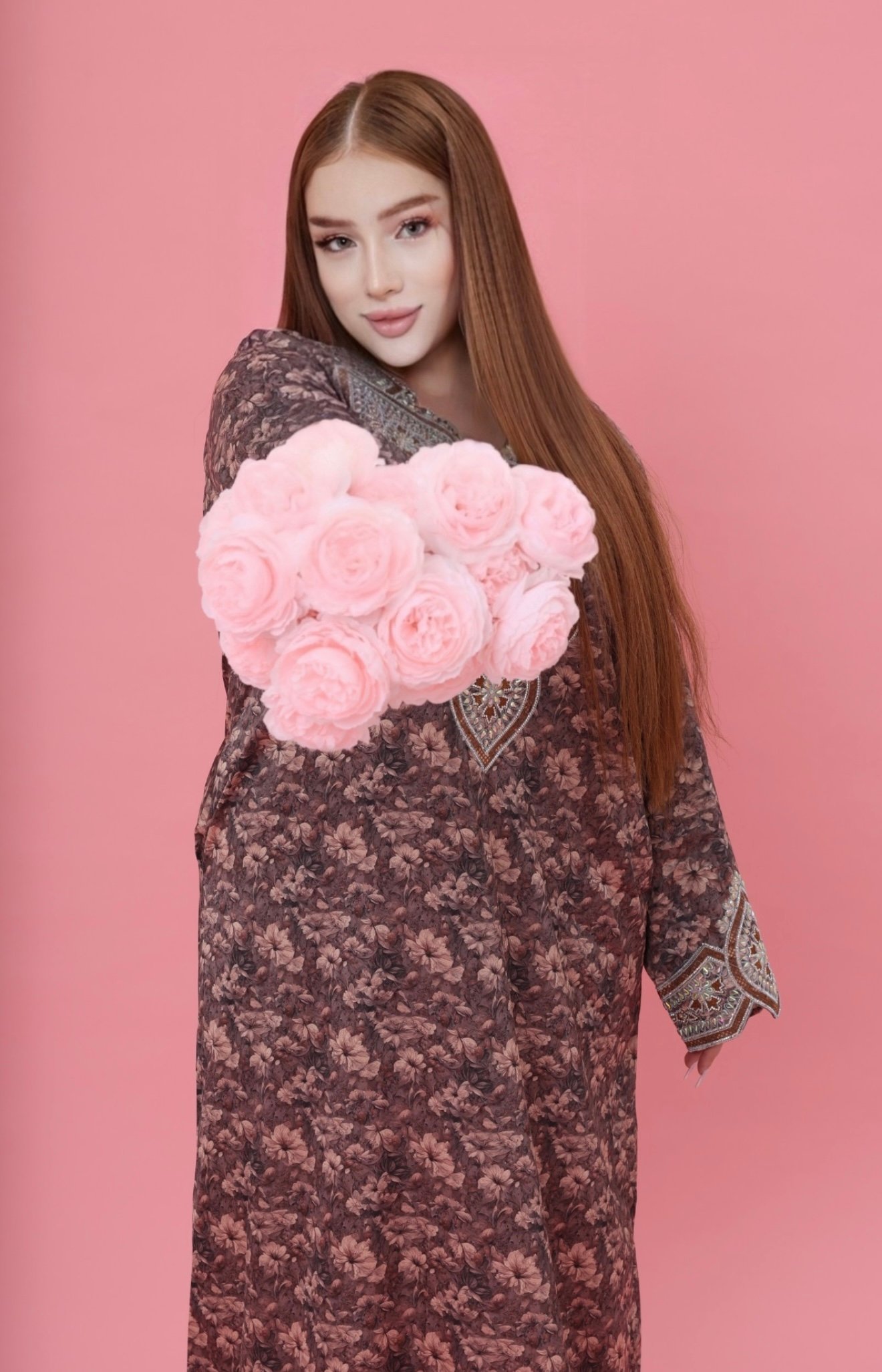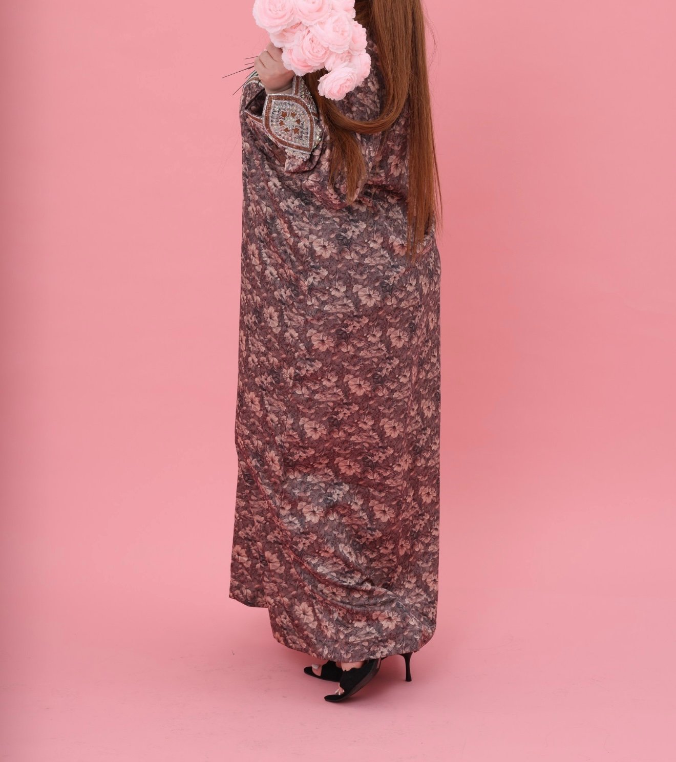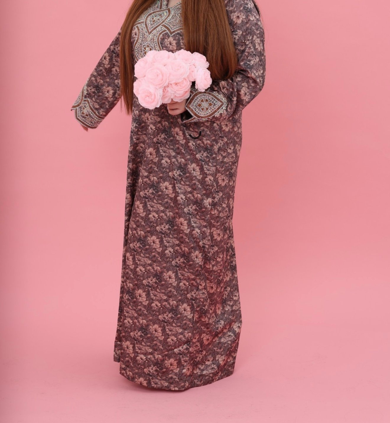 Experience timeless elegance with the Mina Badr Royal Kaftan, where luxurious softness meets exquisite craftsmanship. Designed in a rich brown floral fabric, this piece offers a refined silhouette that flows gracefully with every movement.