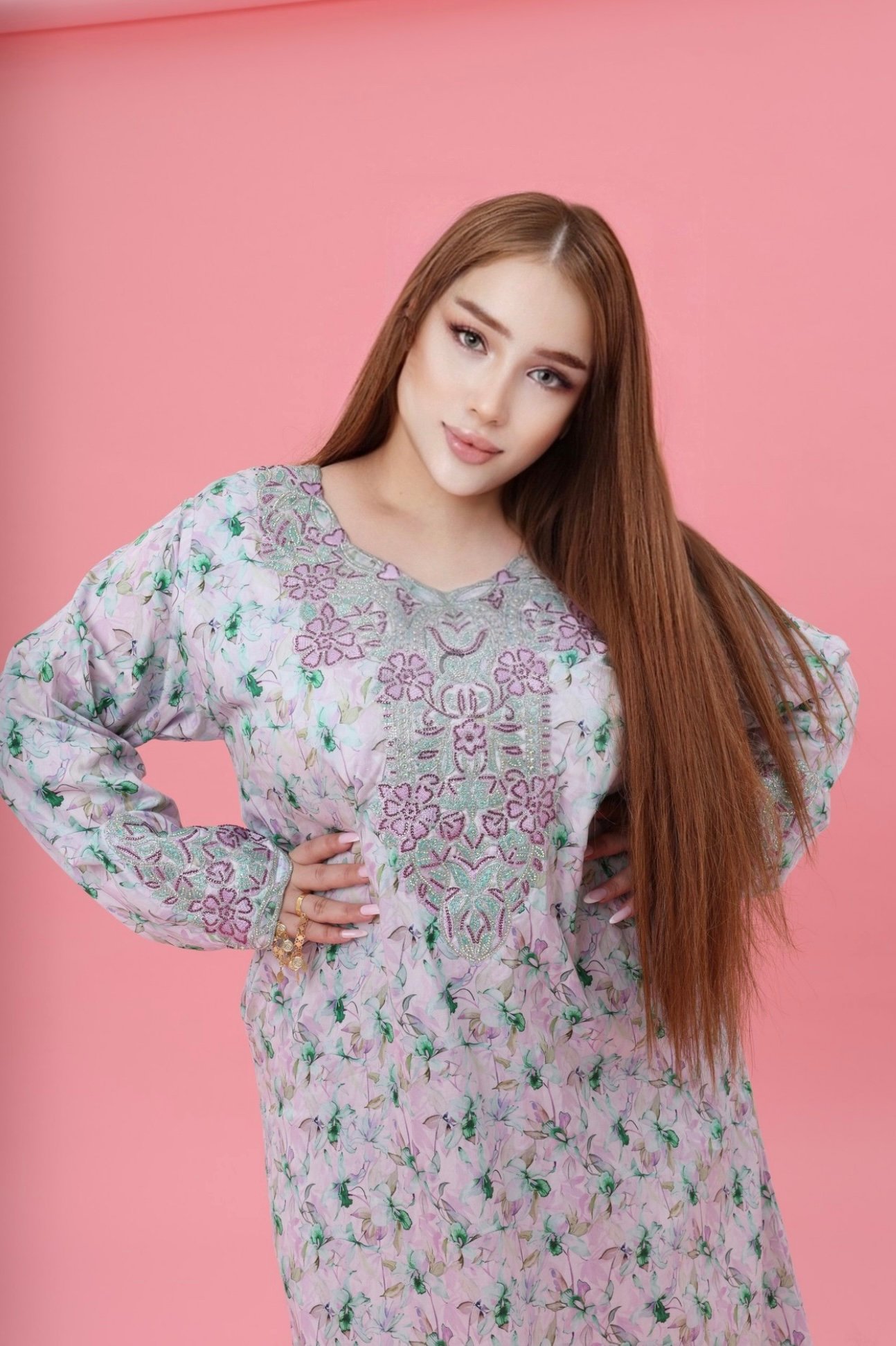 The neckline and sleeves are adorned with shiny pink luxury embroidery, intricately designed to create a radiant and eye-catching finish. The soft flowing fabric enhances comfort while maintaining an elegant silhouette that moves effortlessly with you.